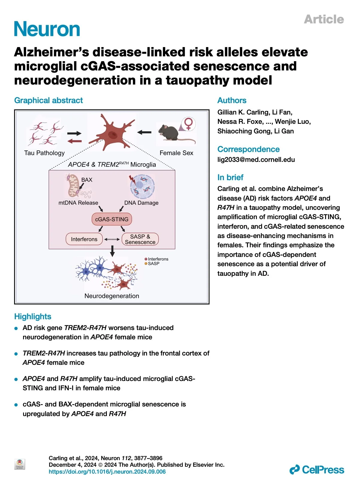[2025.01.07] Alzheimer's disease-linked risk alleles elevate microglial cGAS-associated senescence and neurodegeneration in a tauopathy model. Carling et al. Neuron. 2024