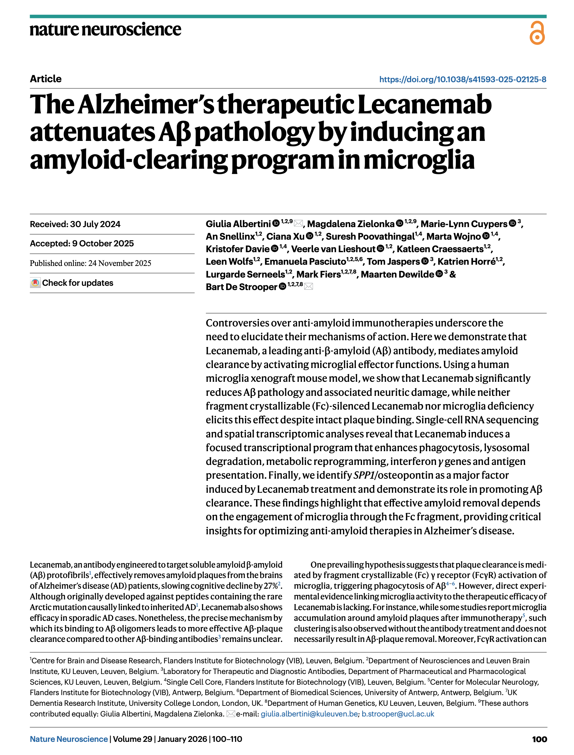 [2026.02.04] The Alzheimer's therapeutic Lecanemab attenuates Aβ pathology by inducing an amyloid-clearing program in microglia. Albertini et al., Nat Neurosci. 2026