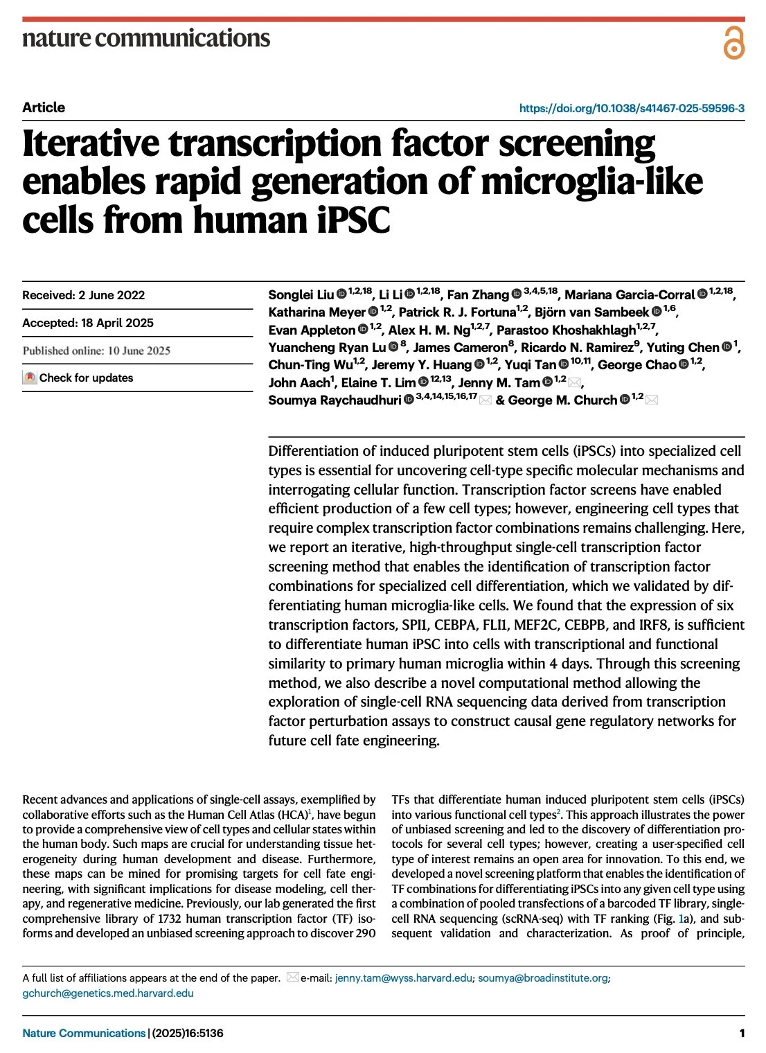 [2025.10.13] Iterative transcription factor screening enables rapid generation of microglia-like cells from human iPSC. Liu et al. Nat. Commun. 2025